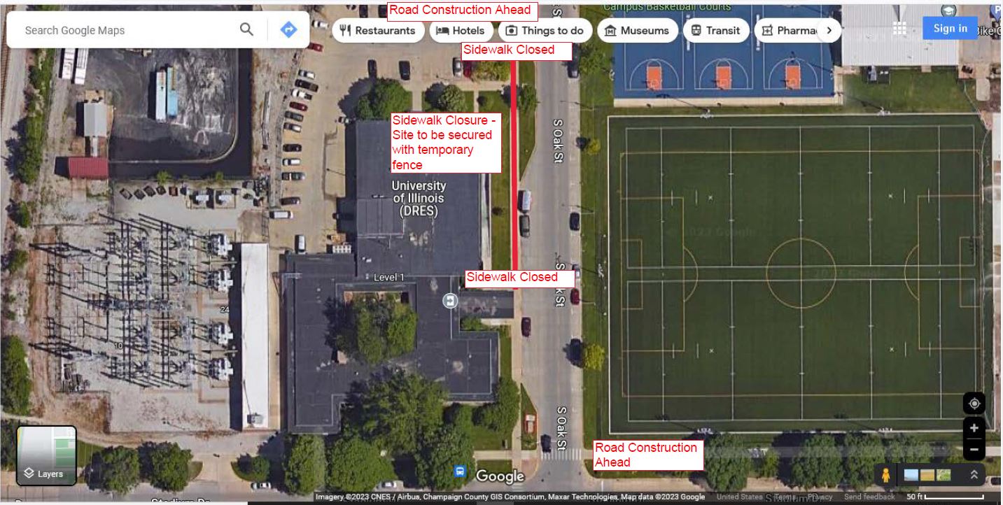 Sidewalk and curb & gutter on the West side of Oak Street, in front of DRES, will be closed from Monday, July 10, 2023 to Friday, July 28, 2023